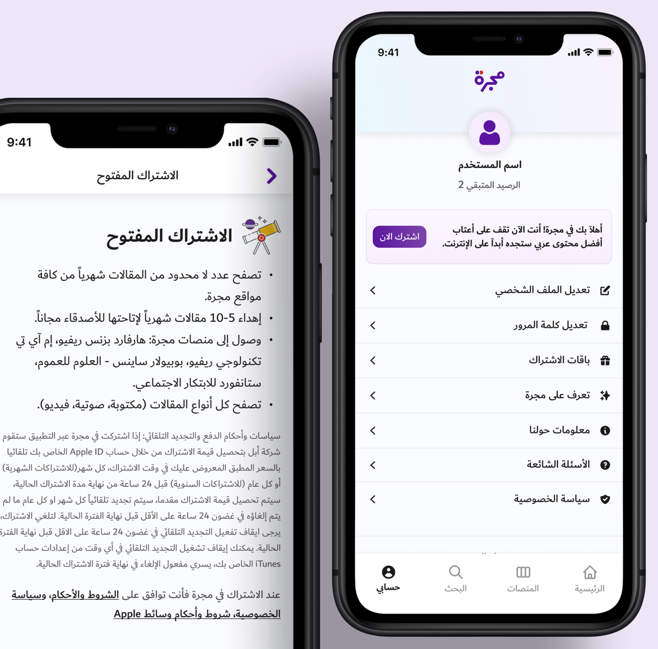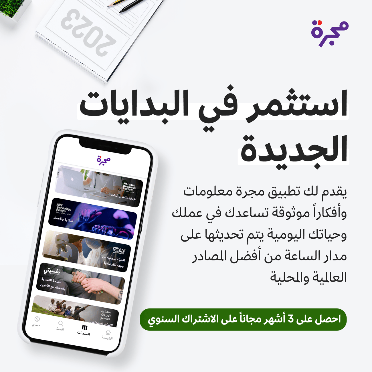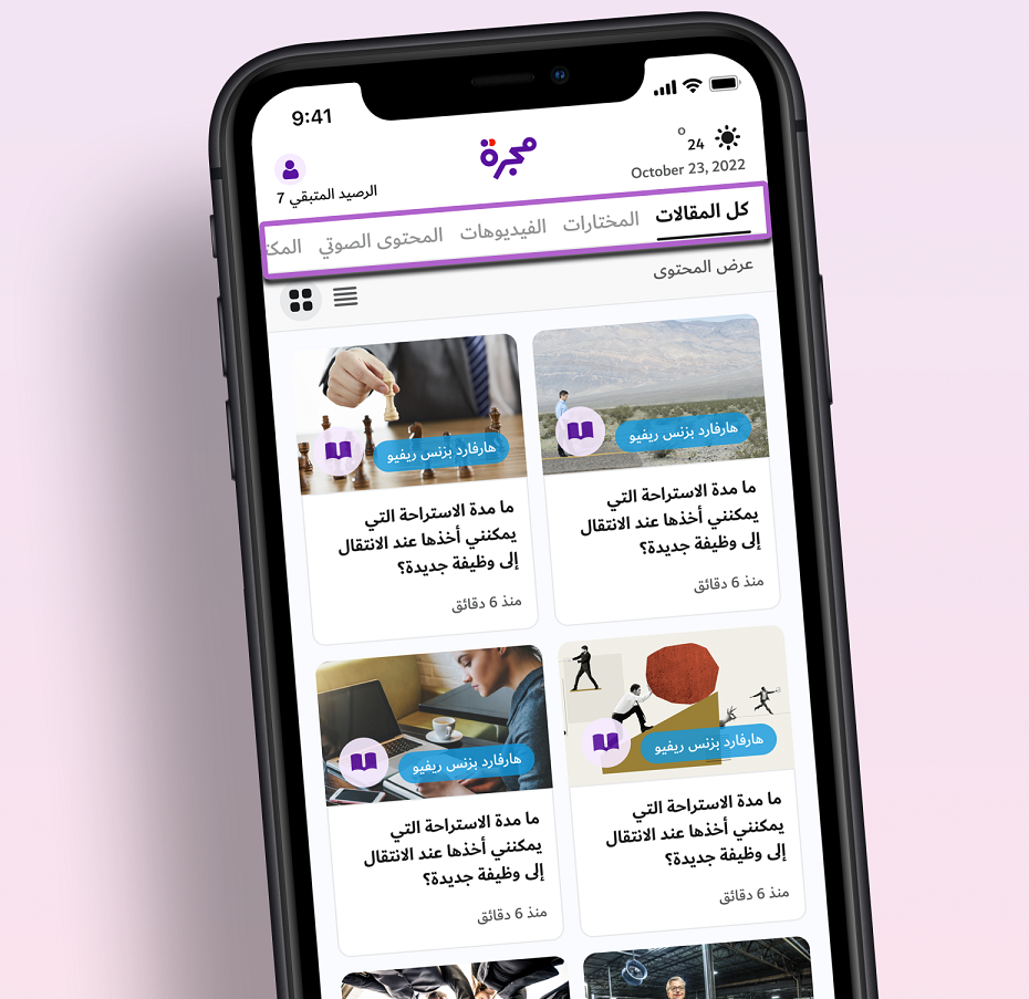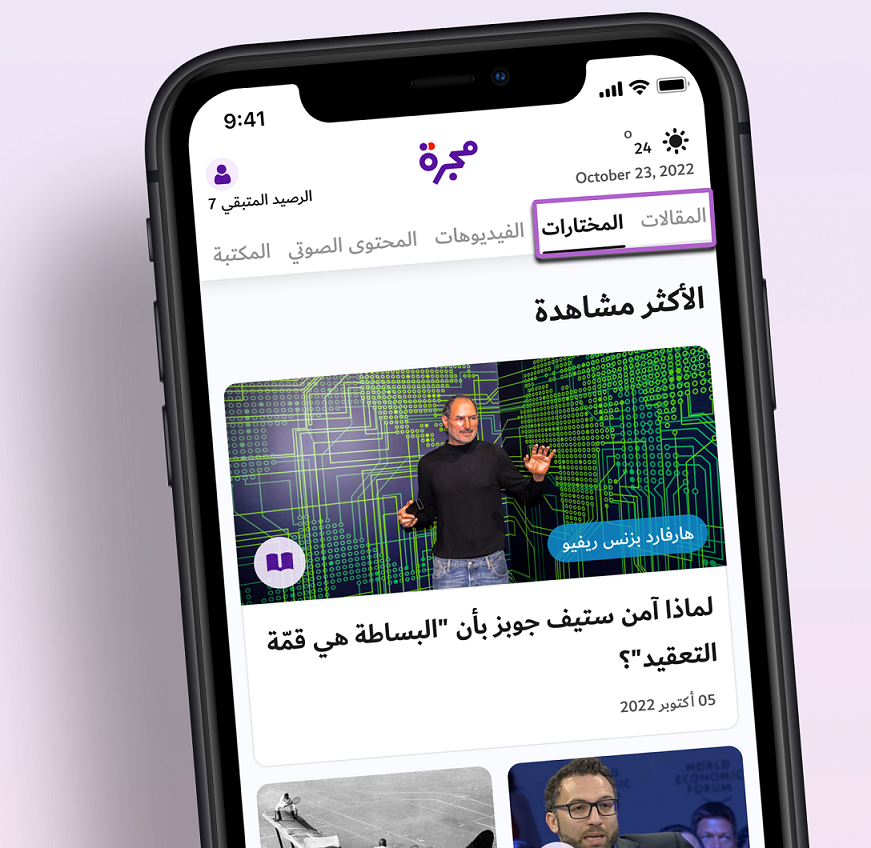 5- ابدأ اشتراكك واستفد من عرض البدايات الجديدة للوصول إلى أكثر من خمسين ألف مقالة، المحتوى الصوتي، البودكاست، الكتب و المجلات. هذا المحتوى يساعدك دائما في تطوير ذاتك وتحقيق طموحاتك. للاشتراك اضغط على حسابي ثم باقات الاشتراك ثم اختر الباقة المناسبة لك.