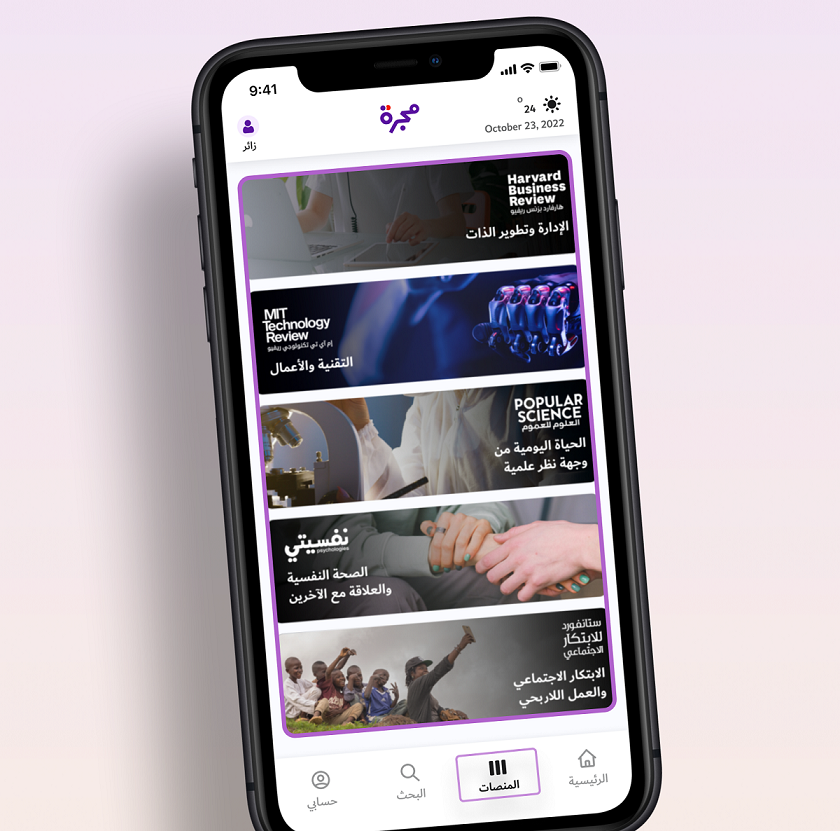 | | | | | | | | صممنا التطبيق ليكون مساعدك الشخصي لتطوير ذاتك ومهاراتك والبقاء على اطلاع بكل جديد، مع كل صباح وفي أي وقت متاح لك، يمكنك فتح التطبيق لقراءة المقالات والتنقل بسلاسة بين المنصات. | | | | | 5 منصات عالمية بين يديك باللغة العربية بتطبيق واحد